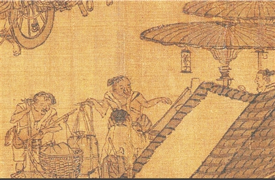 茶坊之外,宋时城市中还有很多流动卖茶的商贩,也就是所谓的“提茶瓶人”。例如,南宋的《斗浆图》主题就是六位“提茶瓶人”互相友茶(斗茶),这也反映了宋朝茶饮供应十分普遍的情景。正因为有了这些四处奔走的“提茶瓶人”,很多来往客商、普通市民都能轻易买茶解渴。这种熙熙攘攘的烟火气,无疑是宋朝商业繁荣的一个生动写照。