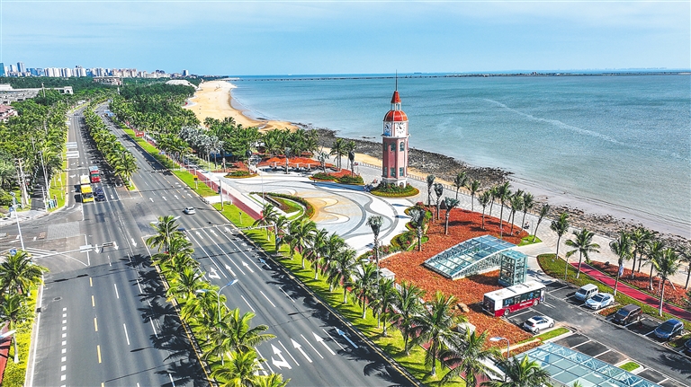 6月20日,航拍贯通更新工程全线完工并对外开放的海口西海岸,13.1公里的“黄金岸线”上慢行道、跑步道、骑行道融汇贯通,滨海美景尽收眼底。