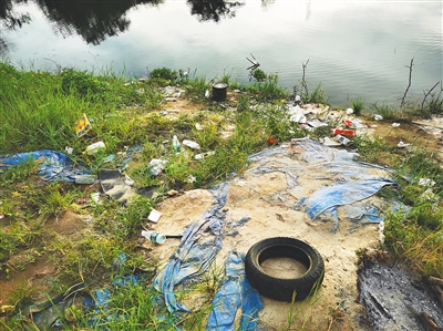 16日下午,记者在山竹沟水库旁边发现,水库的一个补水口下方水质明显发黑,岸边散落了大量的塑料瓶和其他生活垃圾,还有在岸边生火留下的大量黑色炭灰。