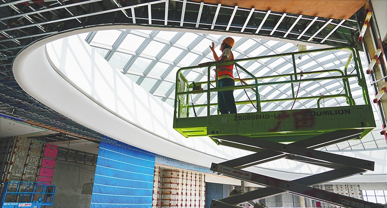 近日,海口国际免税城项目现场,工人们正在进行室内装修施工。目前,该项目商业中心正加紧进行外立面幕墙、机电安装、室外园林景观及室内精装等专业施工,将于今年国庆节前开门迎客。