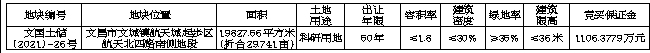 经文昌市人民政府批准,根据《协议出让国有土地使用权规定》(国土资源部第21号令)等法律法规规定,文昌市自然资源和规划局协议方式出让壹(幅)地块国有建设用地使用权。现予公布如下:一、拟出让地块的基本情况和规划指标要求:
