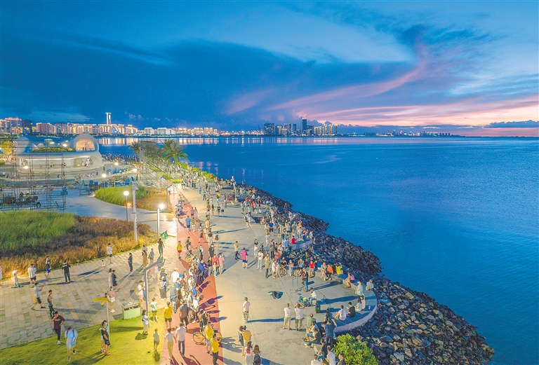 时值盛夏,6月24日傍晚,众多市民游客来到海口湾休闲漫步,在拂面的海风中,感受椰城的“诗和远方”。