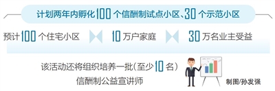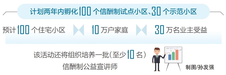 海南省业主委员会协会负责人介绍,虽然信酬制现已形成一整套较完善的业务培训、宣传推广和经验交流材料,但信酬制导入工作有一定的艰巨性、专业性和繁杂性,仅依靠小区业主“摸着石头过河”,规范性、工作效率和成功率无法保证。为有效破解海南社区治理困境和现状,该协会举办为期两年的“百个信酬制小区公益孵化活动”,通过成立海南省信酬制小区公益孵化中心,辐射全省公益孵化100个信酬制试点小区,并评选出至少30个信酬制示范小区,预计将使100个居民小区、10万户家庭、30万名业主受益。