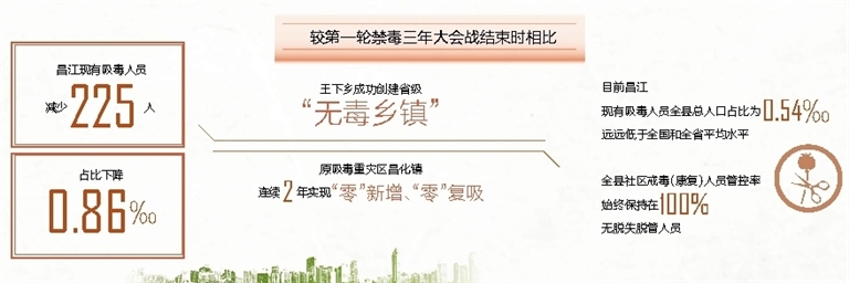 新一轮禁毒三年大会战启动以来,昌江努力推进全县毒品问题治理体系和治理能力现代化,实现毒品形势稳中向好,较第一轮禁毒三年大会战结束时相比,昌江现有吸毒人员减少225人,占比下降0.86‰,王下乡成功创建省级“无毒乡镇”,乌烈、七叉、叉河、海尾等4个乡镇申报培育“无毒乡镇”,原吸毒重灾区昌化镇连续2年实现“零”新增、“零”复吸。目前,昌江现有吸毒人员全县总人口占比为0.54‰,远远低于全国和全省平均水平。