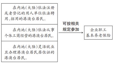 3.港澳台居民。自2020年1月1日起,三类人员可以按规定参加职工基本养老保险:一是在内地(大陆)依法注册或者登记的企业、事业单位、社会组织、有雇工的个体经济组织等用人单位依法聘用、招用的港澳台居民;二是在内地(大陆)依法从事个体工商经营的港澳台居民;三是在内地(大陆)灵活就业且办理港澳台居民居住证的港澳台居民。