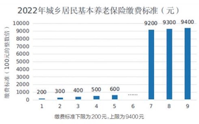 城乡居民基本养老保险按年度缴费。2022年,缴费标准的下限为200元,缴费标准的上限为9400元。参保居民可在缴费标准的上限和下限范围内,自愿选择100元的整数倍金额进行缴费。