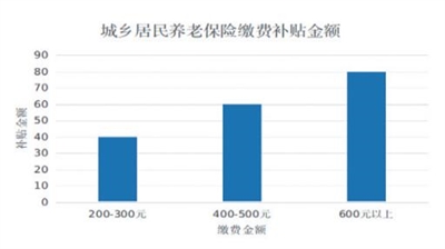 政府对参保居民缴费按年度给予补贴。当年缴费额200元和300元的补贴标准为40元;当年缴费额400元和500元的补贴标准为60元;当年缴费额600元及以上的补贴标准为80元。