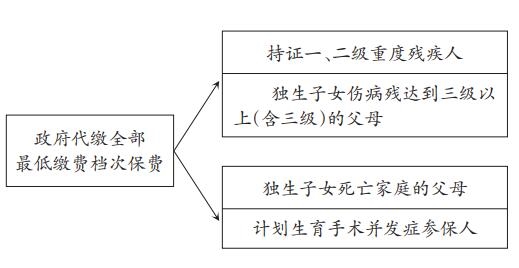 如果是持证一、二级重度残疾人、独生子女伤病残达到三级以上(含三级)的父母、独生子女死亡家庭的父母、计划生育手术并发症等参保人员,政府按照最低缴费档次为其代缴全部保费。