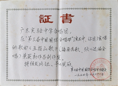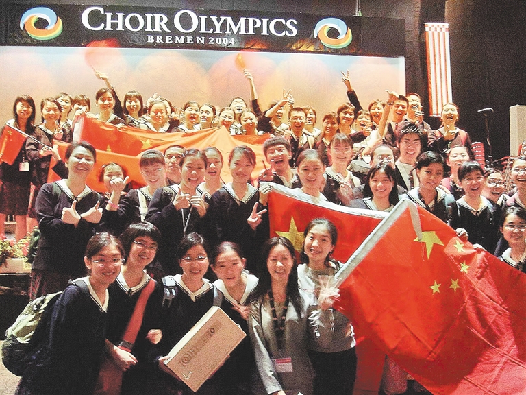 谢明晶:这首合唱歌曲从1993年萌生创作念头到1994年的6月份完成,用时一年又四个月。这么长的时间,我和父亲多次跟张以达老师不断地探讨才最终完成。1994年就在第三届中国国际合唱节上演唱了。古朴而又清新的旋律,让在场的评委和观众深感震撼,获得了优秀新作品奖。因为这首歌的技术难度,后来在2002年的时候它又被其他的合唱团带到韩国第二届奥林匹克合唱节上去演唱;它最鼎盛的演唱应该是在2004年,我所指挥的广东实验中学合唱团在第三届德国不来梅的国际奥林匹克国际合唱节的比赛中,再次向世人展示了这首曲子优美、气势庞大的魅力,得到观众和评委们的高度赞赏,我们获得了冠军,算是实现了父亲的一个夙愿。