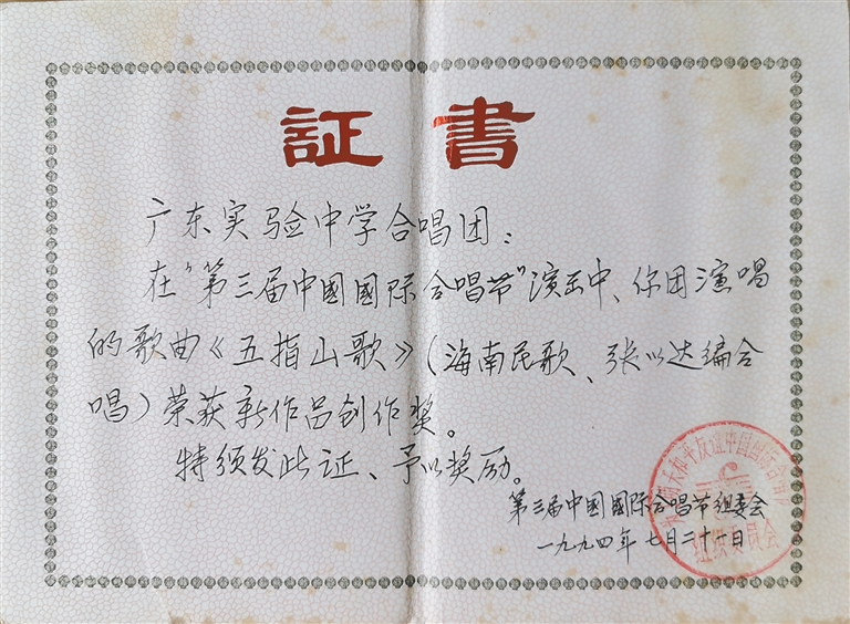 这首歌成功演绎之后,其实也激发了我对中国民歌,特别是海南民歌的发掘。2001年,我还跟父亲成功改编了一首黎族民歌《斗牛调》和儋州调声,这成为我们合唱团经久不衰的曲目。每当乐曲在舞台深处响起,我都会看到父亲微笑的面容。他一直以音乐陪伴着我,直到永远。