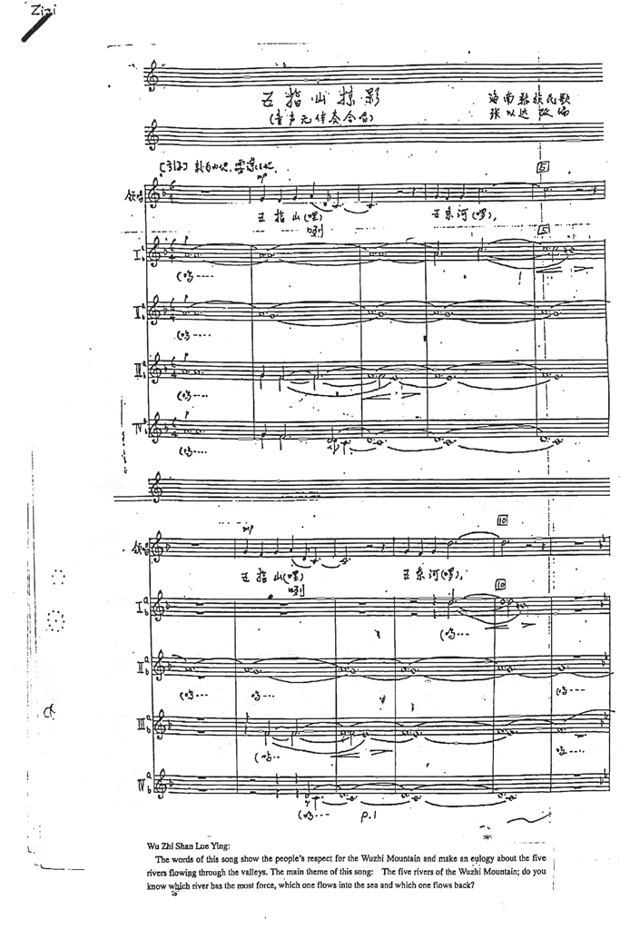 当时跟父亲是这样讨论的,因为要参加1994年的中国国际合唱节,我跟父亲说想找一首有特点的,能够代表海南旋律的曲子。那天下午我们聊了很久,父亲也唱了很多民歌给我听。这些民歌我都非常喜爱,突然父亲讲了一句,他说要不然你就唱那首《五指山歌》吧。《五指山歌》我非常熟悉。父亲这一说,还情不自禁地给我哼唱了几句,引起了我非常强烈的共鸣!当时我就觉得前面的这几句,“五指山咧五条溪罗,你知哪条流水多罗……”非常地引人入胜!我跟父亲同时都有一种感觉,这个歌可以用,但是如此短小精炼的一首山歌体裁的东西,怎么把它变成一首能够参与到世界比赛,在国际舞台更有表现力的合唱作品呢?这还需要请一位非常有经验的作曲家来重新编创。