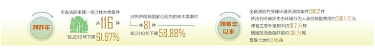 为确保生态环境修复取得实效,海南法院还积极联动职能部门与科研院所,全面跟踪督促被告人履行生态修复义务,将增殖放流、补植复绿、劳务代偿等多种生态修复举措运用到环境资源案件审判和执行过程中。2018年以来,全省法院共受理环境资源类案件10852件,依法判令破坏生态环境行为人承担修复费用约2804万元,修复生态补植树木约18.2万株,增殖放流鱼苗虾苗约138万尾,复垦土地约345亩。