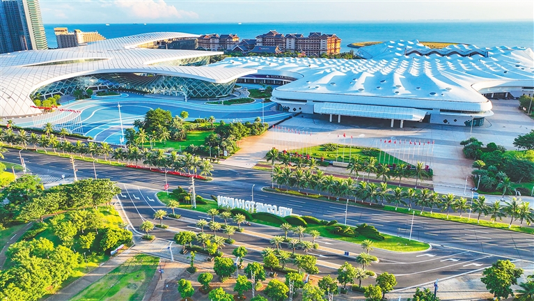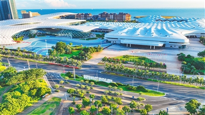 6月27日,俯瞰海南国际会展中心,工作人员正加紧美化会场周边环境,为第二届中国国际消费品博览会做准备。