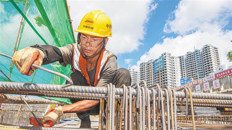 6月28日,在三亚中央商务区核心地段,由中铁建设集团承建的自贸港旅游航空总部项目建设如火如荼,图为工人在作业中。