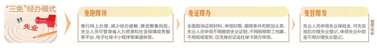“三免”经办模式包括:“免跑即领”,推行网上办理,减少经办接触,降低聚集风险。失业人员可登录省人力资源和社会保障政务服务平台、电子社保卡小程序等渠道申领。“免证即办”,全面取消证明材料、申领时限、捆绑条件和附加义务,失业人员申领不用提供失业证明,不用转移职工档案,不用现场签到,仅凭身份证或社保卡就可申领。“免登即发”,失业人员申领失业保险金,可先发放后办理失业登记,申领失业补助金不用办理失业登记模式。