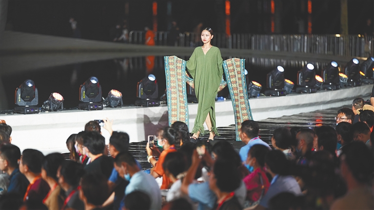 本报海口6月28日讯 (记者尤梦瑜)6月28日, 2022年(第二届)海南锦绣世界文化周(以下简称文化周)在海口开幕。延续2020年首届文化周“传承 创新 共创锦绣世界”主题,本届文化周以更开阔的视野,汇集全国优秀传统织绣印染技艺精品,推动锦绣文化交流。以极富设计感的云洞图书馆为“幕”,当晚,文化周开幕式为海口市民游客奉上别开生面的“衣被天下”时装大秀表演。