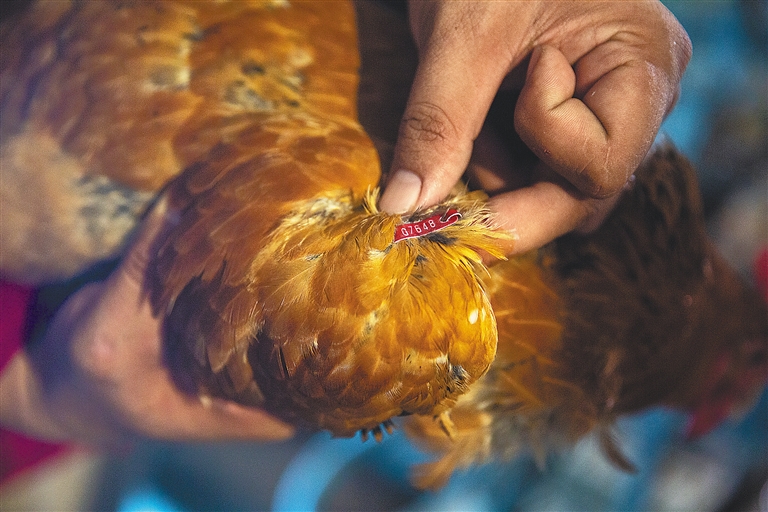 在潭牛公司运营的文昌鸡国家级保种场生产区,每只鸡的翅膀上都有一个编码,方便工作人员追踪系谱和记录产蛋、体重、饲料配方等相关数据,精细化开展保种、育种工作。