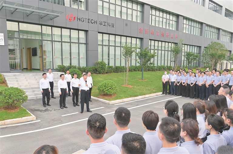 在车间大楼前,习近平同企业职工亲切交流。习近平指出,我国是世界第二大经济体,但还有不少短板,一些产业的基础还不是很牢固,进一步发展必须靠创新。全面建设社会主义现代化国家,实现第二个百年奋斗目标,创新是一个决定性因素。党中央高度重视科技创新,实施科教兴国战略和创新驱动发展战略。如果我们每一座城市、每一个高新技术开发区、每一家科技企业、每一位科研工作者都能围绕国家确定的发展方向扎扎实实推进科技创新,那么我们就一定能够实现既定目标。我们这一代人必须承担起这一光荣使命。科技创新,一靠投入,二靠人才。看到这里聚集了不少精英人才,大家都很年轻,充满活力,我感到很高兴。党中央十分关心科技人才成长,各级党委和政府要尽可能创造有利于科技创新的体制机制和工作生活环境,让科技工作者为祖国和人民作贡献。希望大家继续努力,取得更大成绩。