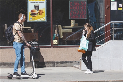6月29日,在俄罗斯首都莫斯科,行人经过一处外汇兑换点的汇率显示屏。