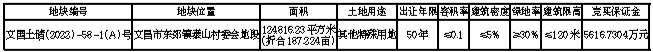 经文昌市人民政府批准,根据《协议出让国有土地使用权规定》(国土资源部第21号令)等法律法规规定,文昌市自然资源和规划局协议方式出让壹(幅)地块国有建设用地使用权。现予公布如下:一、拟出让地块的基本情况和规划指标要求: