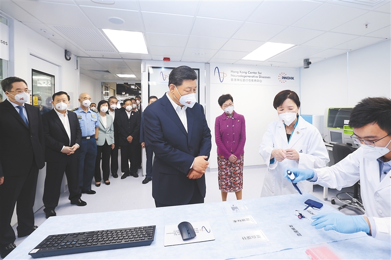 习近平来到香港神经退行性疾病中心,听取中心研究团队在阿尔茨海默病诊断治疗等方面取得的成绩,勉励大家再接再厉,在攻坚克难中追求卓越,创造更多引领世界潮流的科技成果。