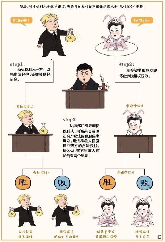堵点正是改进工作的起点。省知识产权局联合市场监督管理局、海口海关,以制度创新为抓手,推出联合执法新模式。一方面,突出“联”字,以密切协作打破单纯依靠海关监管的局限,在优势互补、联合监管中,实现对侵权行为“一条龙”查处、“全链条”打击;另一方面,突出“先”字,以“先行禁令”下“先手”、抢“先机”,第一时间排除侵权损害,并依托自贸港知识产权法院,最大程度守护合法权益。不管是“联”,还是“先”,无不体现出对知识产权以及公平竞争市场环境的重视,彰显出创新意识、法治思维。
