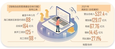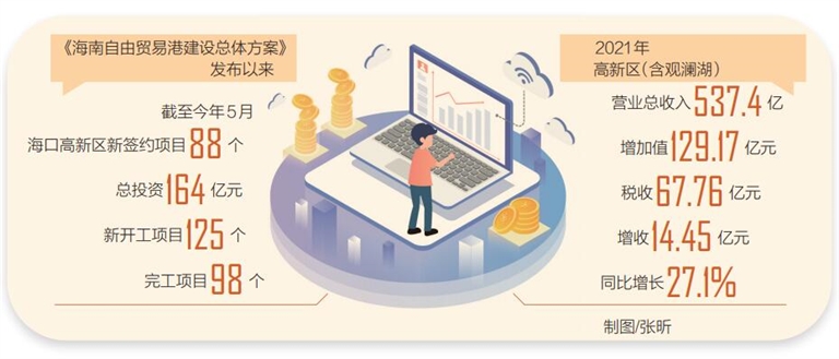 《海南自由贸易港建设总体方案》发布以来,海口国家高新区作为海南自贸港唯一的国家级高新区,踏上了“扩区发展、多元发展”之路,从“一城四园”拓展为“一区七园”,从主攻高新技术产业延展到涵盖旅游业、现代服务业、高新技术产业等产业。2021年,高新区(含观澜湖)营业总收入537.4亿,增加值129.17亿元;税收67.76亿元,增收14.45亿元,同比增长27.1%;固定资产投资104亿元,同比增长31%。