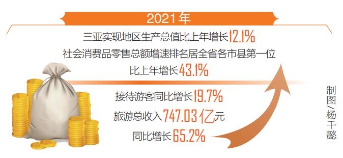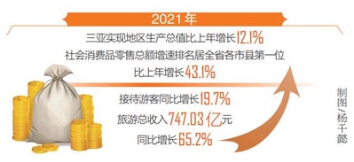 党建引领推动发展加速跑。崖州湾科技城围绕招商引资、营商环境、人才服务、载体建设、文化供给实施党建引领为核心的“1+5”旗帜领航示范工程,目前园区累计注册企业超过7000家。去年,三亚实现地区生产总值比上年增长12.1%;社会消费品零售总额增速排名居全省各市县第一位,比上年增长43.1%;接待游客同比增长19.7%,旅游总收入747.03亿元,同比增长65.2%。