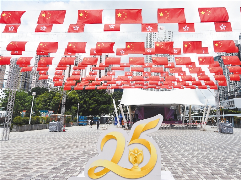 大街小巷国旗、区旗飘扬,巴士、电车换上红色“新装”……回归祖国25周年纪念日来临之际,香港到处洋溢着喜庆氛围。