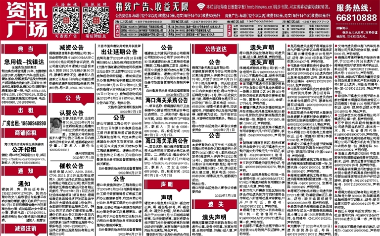 ●刘震宇(于2022年6月28日)遗失居民身份证,号码:460103198510101511,特此声明。