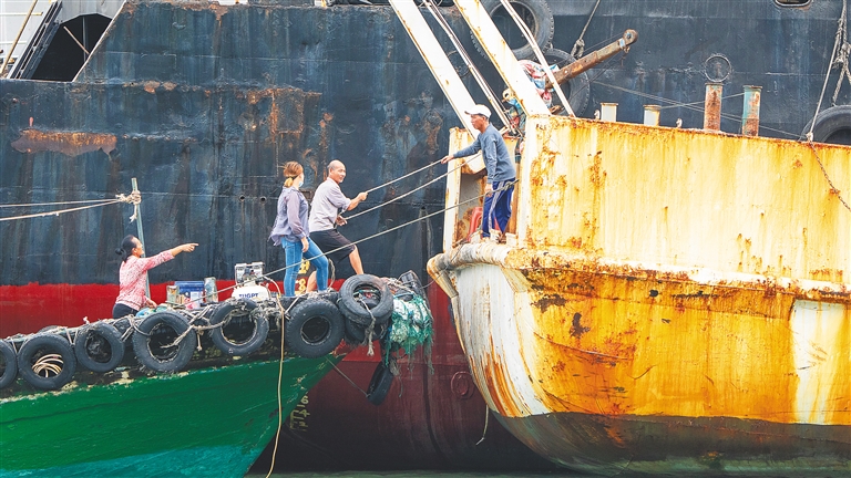 在文昌清澜港渔政码头,大型船只用缆绳固定,整齐停靠在港内,文昌渔政部门、市公安局、市综合行政执法局工作人员逐个检查船只,排查安全隐患,引导渔民加强防风意识,尽快转移上岸。