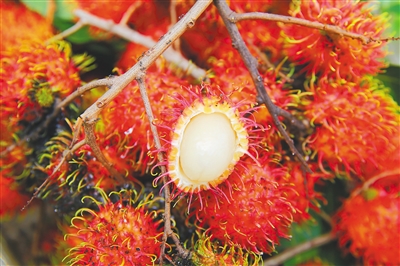 当琼岛荔枝季结束,红毛丹便登台亮相了。红毛丹红彤彤的果壳上满布细密的毛刺,剥开粗糙的表皮,里面是莹白精致的果肉,咬上一口,汁多、肉脆、清新,甜酸可口。