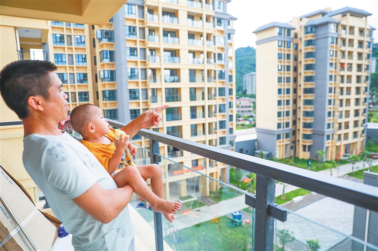 6月29日,在五指山市通什镇山庄路的生态搬迁小区里,畅好乡毛庆村的村民吉圣锋带着孩子住进新房。目前,在海南热带雨林国家公园生态搬迁(五指山市)安置工作推进下,5个村民小组143户村民大部分都已签约住进新家,后续就业岗位安排等工作正有序进行中。