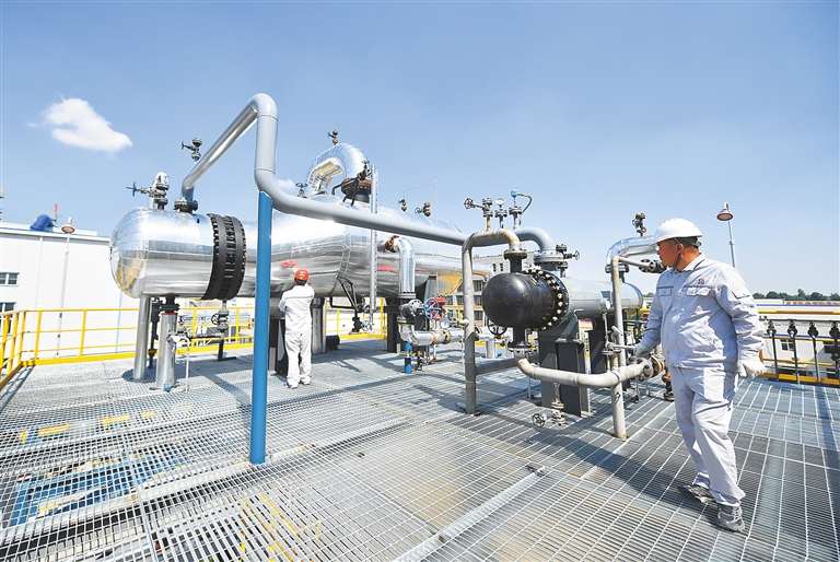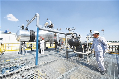 在陕西延长石油榆林煤化有限公司,工作人员查看二氧化碳捕集装置运行情况(6月30日摄)。