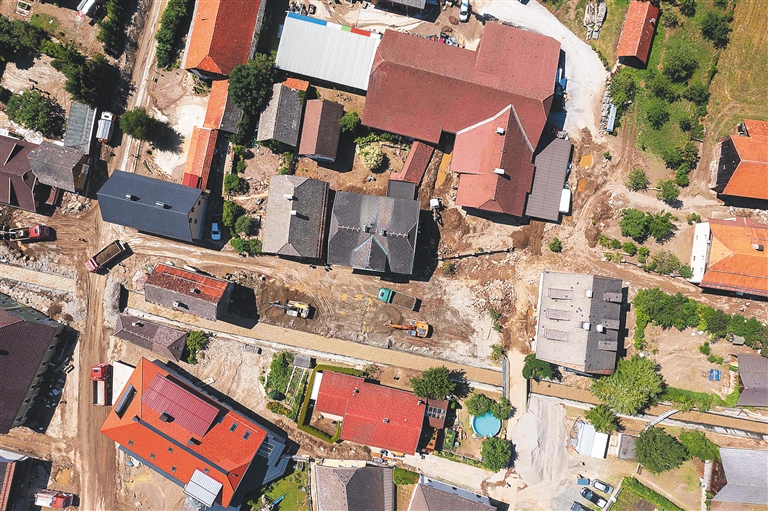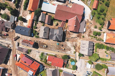 这是6月30日在奥地利卡林西亚州特雷芬航拍的清理淤泥的工程车辆。