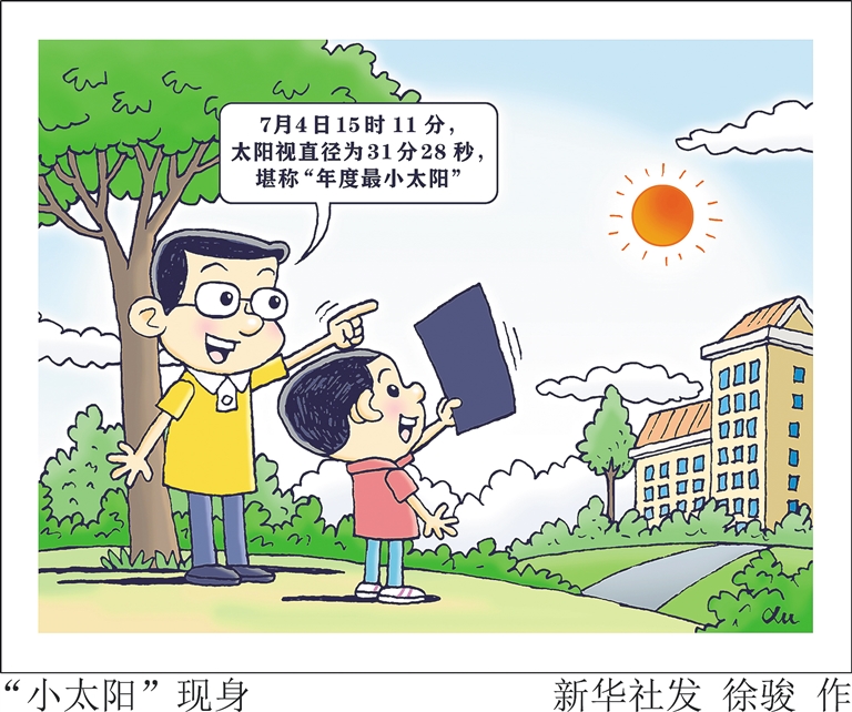 今年,地球运行到远日点的时刻是7月4日15时11分。此时,太阳视直径为31分28秒,堪称“年度最小太阳”,大约比今年1月4日地球通过近日点时可见的日面视直径小了3.4%。