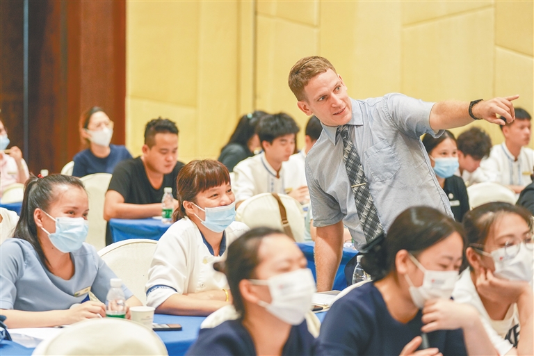 7月5日,在三亚湾一酒店,来自三亚各酒店、景区等行业的学员们在外教的带领下,学习英语服务用语。