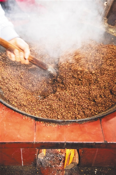工人采摘油茶果后,先剥出油茶种仁,压碎后入锅加热翻炒。炒制时,3个师傅接连翻炒50分钟,才能炒出一锅20斤到30斤的种仁,然后再压榨,制出的茶油就有了浓郁的香味。