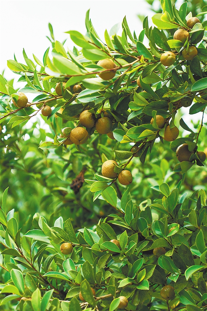 烈日下,一棵棵低矮的油茶树长势茂密,树冠呈伞状,叶片油绿,枝叶间挂着一个个青褐相间、鸡蛋大小的果实,有点像缩小版的柚子。