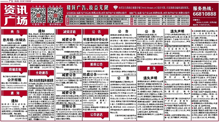 海南七洲海洋休闲渔业有限公司原注册资本伍仟陆佰伍拾陆万元人民币减资至壹仟万元人民币,其债权债务不变。特此公告。