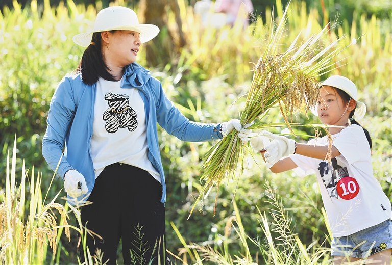 7月9日,在五指山市毛阳镇牙胡村牙胡梯田,游客正在参与水稻收割亲子活动。