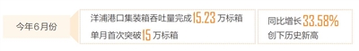 本报洋浦7月9日电(记者林书喜 特约记者李灵军 通讯员符润彩)眼下,是洋浦港口作业的旺季。海南日报记者7月9日从洋浦交通运输和港航局获悉,今年6月份,洋浦港口集装箱吞吐量完成15.23万标箱,单月首次突破15万标箱,同比增长33.58%,创下历史新高。在6月份强势上涨的带动下,今年上半年,洋浦港口集装箱吞吐量达82.29万标箱,同比增长45.67%。