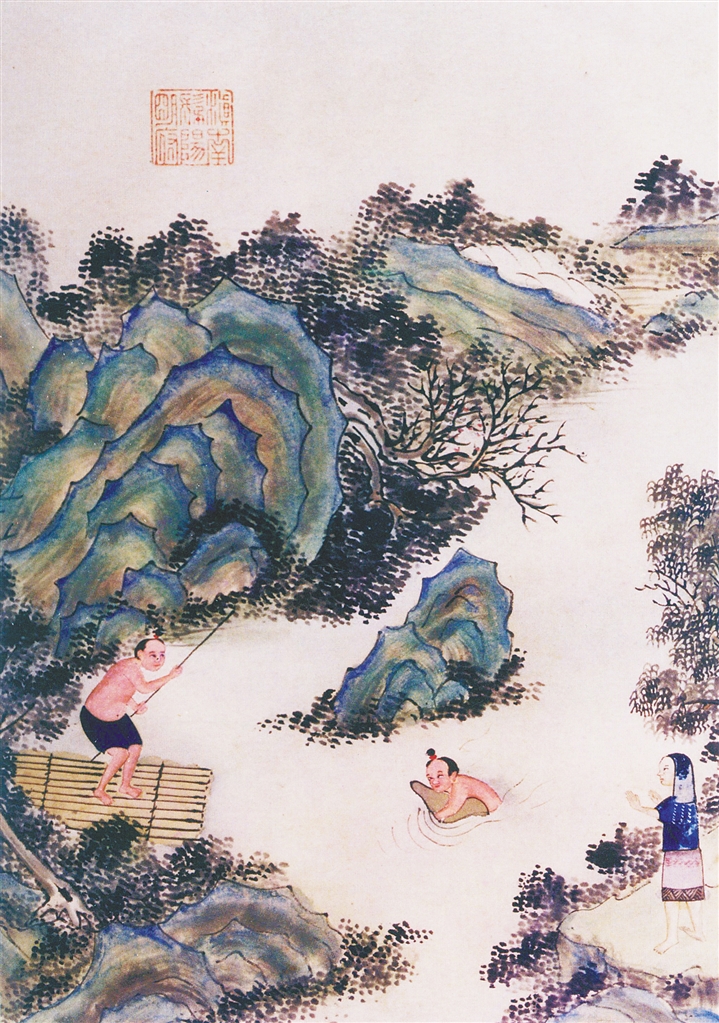 明清时期,许多产自海南的贡木——成材的花梨木就是由黎族人用他们制作的竹木筏运出深山,再由官船经琼州海峡源源不断地运往京城。《琼黎一览图·运木》记述了黎族人采伐花梨木并运出山的情景:“黎人每伐一株,必经月而成材,合众力推放至山下涧中,候洪雨流急,始编竹木为筏,缚载于上,以一人乘筏,随流而下。”