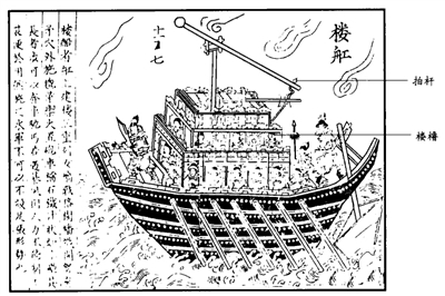 这支部队乘坐的是船高首宽、外观似楼的楼船,可远攻也可近战,是当时世界上战斗力最强的水师之一。楼船可容兵员数百名,配有世界上最早的橹和舵,每层的四周都建有“女墙”,甲板上还有硬木制成的“战格”,四壁都蒙上了皮革以加强防护。船的顶层有军旗手,其在战斗中可指挥士兵作战。更为难得的是,楼船四周还有由艨艟、斗舰、赤马舟等组成的护卫船只,护卫船只上有斥候、先登等兵员,这种船舰组合形式,与现代海军中的航母编队有几分相似。
