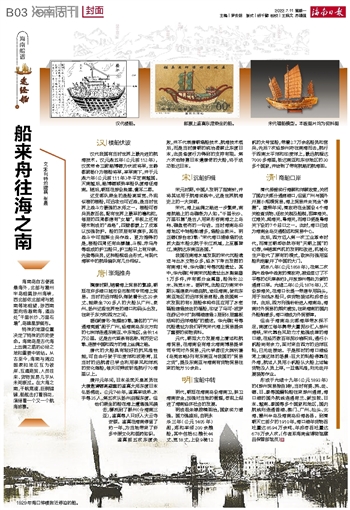宋代,海上丝绸之路进一步繁荣,南海航路上的岛礁渐为人知。“千里长沙、万里石塘”是古人用来形容南海之上岛屿、礁盘密布的一句话。当时海南岛沿海地区中转船舶增多,造船业勃兴。明正德《琼台志》载:“宋代海口浦修造的优质大型木船北航于长江流域,上至嘉陵江,南航达东南亚各国。”