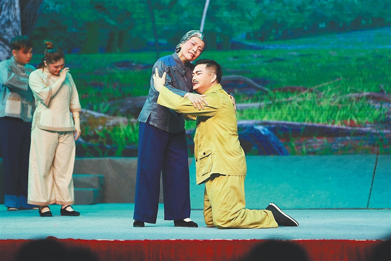 第六场,李荷花悲痛欲绝地在王云鹏的“坟墓”前哭泣时,遇到了在朝鲜战场上负伤奉命回国养伤的王云鹏。剧情出现大转折,两位主角经历大悲大喜、大起大落,这十分考验他们的表演功力。