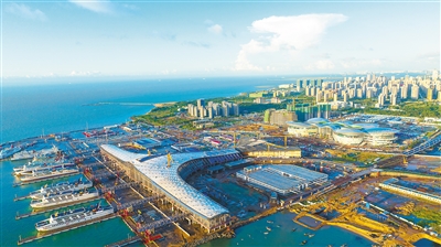 7月12日,俯瞰海口新海滚装码头客运综合枢纽站工程。目前,该工程建筑主体全部完工,屋面钢结构网架也已安装完成,正进行金属屋面铺设、玻璃幕墙安装等一系列工作。本报记者 袁琛 摄