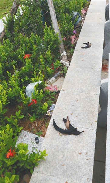 带有残羹剩饭的快餐盒、塑料袋被随意丢弃,纸质饮料杯、透明饮料瓶散落在草地上,烟头、瓜子壳以及槟榔汁液随处可见……7月6日至7日,海南日报记者在三亚市南边海路南海山庄北门至渔村路口路段的街边绿地走访时,看到了这一幕。