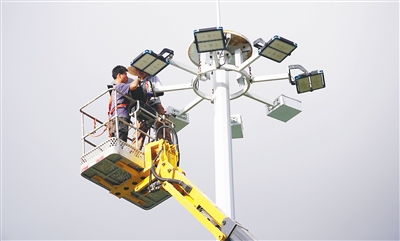 7月11日,在海南国际会展中心,工人在进行高杆灯的更新,为迎接第二届中国国际消费品博览会做准备。本报记者 张茂 实习生 吴淑琳 摄
