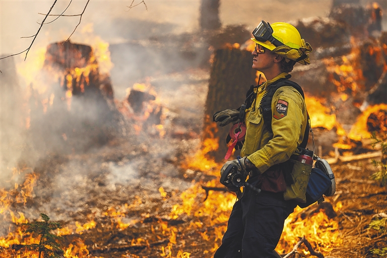 7月11日,一名消防员在美国加利福尼亚州约塞米蒂国家公园参与灭火行动。